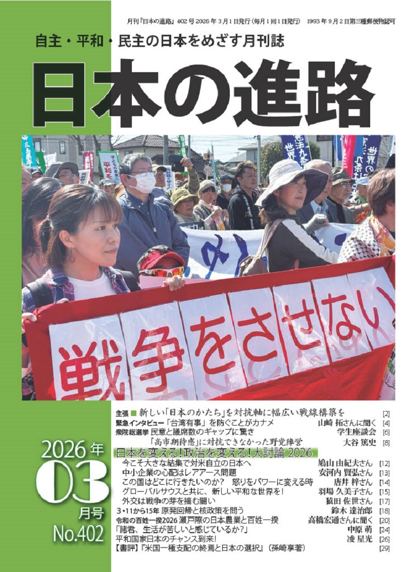 昨年の参議院選挙では、衆議院に続いて「裏金問題」や統一教会との癒着などに批判が集中し、与党の過半数割れという結果となりました。その後、石破政権が退陣し、高市政権が発足しましたが、公明党が連立から離脱し、新たに日本維新の会との連立合意のもと、これまで以上に「戦争をする国」づくりがすすめられています。とくに、軍事費のGDP(国内総生産)比2%目標を前倒しで実施し、殺傷能力のある兵器の輸出のための規制緩和や「国家情報局」の新設と「スパイ防止法」の制定など、軍事大国化にむけた反動政策が強行されようとしています。 続きを読む