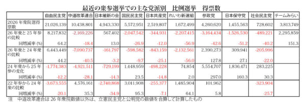 2月8日投開票の第51回衆議院議員総選挙結果は自民が316議席を確保し、単独で定数の3分の2を上回る結果となった。一方、反自維政権の受け皿と見られていた中道改革連合は、公示前167議席(立憲144、公明21、その他2)から49議席へ大幅に減らした。参政とみらいが、それぞれ15と11議席を獲得した。また、初の衆院選に臨んだみらいが381万票を獲得したことは、一定の支持を得たものとみてよいだろう。 続きを読む